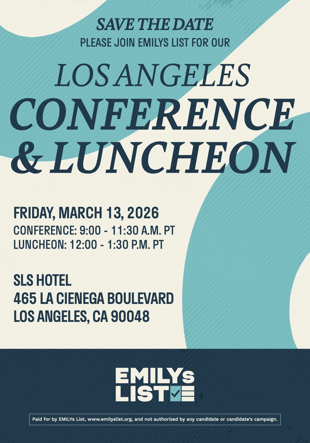 Please join us for EMILYs List’s annual Los Angeles Conference and Luncheon! We look forward to bringing our California community together to hear from Democratic pro-choice women making an impact in elected office. With so much at stake in this election cycle, our work at EMILYs List is critical. We plan to leverage our proven model to recruit, prepare, and elect women who can flip key seats and help Democrats take back power in the midterms. We hope you can join us in Los Angeles and learn more about our Blueprint to Win in 2026!