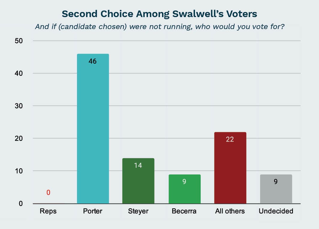 In what currently amounts to a two-candidate Democratic race, Katie Porter is tied with Tom Steyer and poised to receive the greatest boost in voter enthusiasm and support in the coming weeks. An internal campaign poll found nearly half of Swalwell supporters (46%) named Katie Porter their second choice, compared to just 14% who favored Steyer — even after Steyer had spent 40 million in paid advertising.